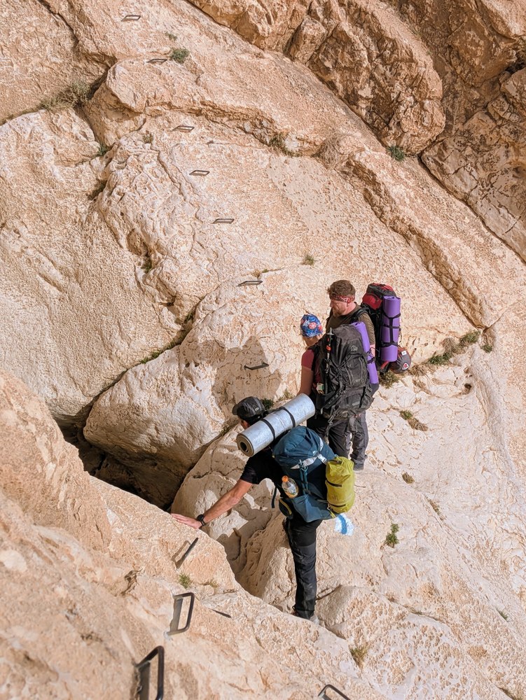 Однако же уже часа через полтора ходьбы мы подошли к подъёму от которого мы все реально охуели. Крутое ущелье, по сути русло водопада. Кое где набиты скобы (причем на большом расстоянии, так что , скажем левой ногой на скобу, правой упираешься в склон, левой на следующую скобу), а кое где их небыло. Всем запомнился подъем метров 50 без скоб по скользкой скале под наклоном... ну сколько... 40 градусов? 50? что то такое. Т.е. было реально страшно.